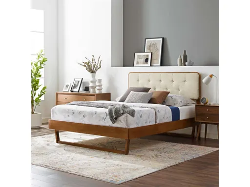 Infuse modern style into your master bedroom or guest room decor with the retro detail and organic aesthetics of the Bridgette Tufted Wood King Platform Bed. Inspired by mid-century style, the upholstered headboard on this king bed frame features a classic button tufted design framed in rich wood grain. This platform bed frame is a sturdy addition to the bedroom with a durable wood, MDF, and veneer construction and an angular rubberwood frame. Eliminating the need for a box spring, this king bed is complete with a wood slat support system, reinforced center beam, and supporting legs that make it a lasting mattress foundation for memory foam, latex, innerspring, and hybrid mattresses. Assembly required. King Bed Frame Weight Capacity: 601 lbs.