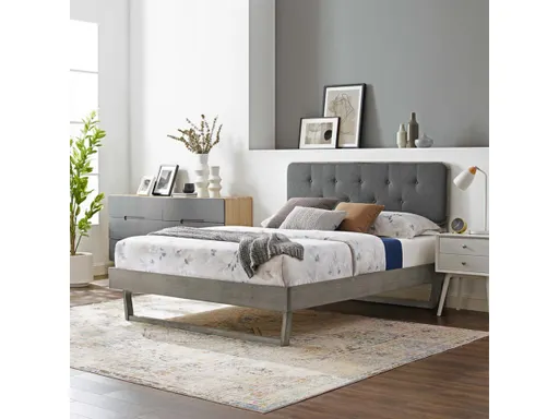 Infuse modern style into your master bedroom or guest room decor with the retro detail and organic aesthetics of the Bridgette Tufted Wood King Platform Bed. Inspired by mid-century style, the upholstered headboard on this king bed frame features a classic button tufted design framed in rich wood grain. This platform bed frame is a sturdy addition to the bedroom with a durable wood, MDF, and veneer construction and an angular rubberwood frame. Eliminating the need for a box spring, this king bed is complete with a wood slat support system, reinforced center beam, and supporting legs that make it a lasting mattress foundation for memory foam, latex, innerspring, and hybrid mattresses. Assembly required. King Bed Frame Weight Capacity: 601 lbs.