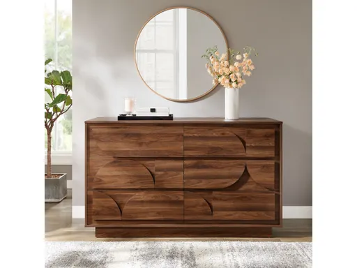 The Bulwark 6-Drawer Dresser combines modern brutalist design elements with ample storage, making it a standout chest cabinet in any space. Featuring a unique geometric design on the drawer fronts, this 6 dresser drawer showcases a striking raised shape pattern motif that adds a touch of artistic flair to a primary bedroom or guest bedroom. The plinth base and framed edges enhance its structured look, while the wood grain laminate finish offers a warm, natural appeal. Crafted from durable particleboard, the Bulwark 57 inch wide dresser is designed for longevity, with full-glide drawers providing smooth and easy access. Versatile in use, it serves as a perfect modern dresser for the bedroom or a geometric accent cabinet the living room. Whether you’re searching for a double dresser or a storage cabinet for your living space, the Bulwark large dresser with geometric drawer fronts seamlessly combines style and functionality. Assembly required.