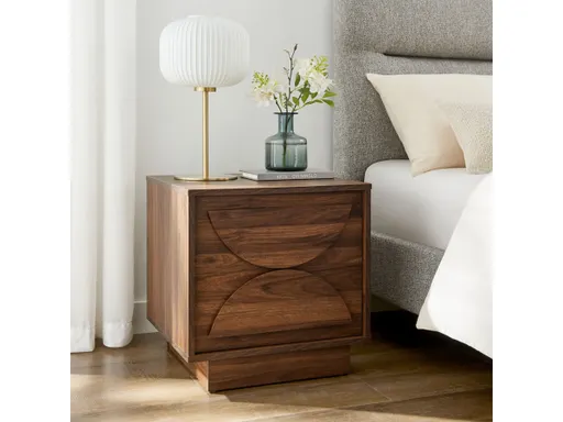 The Bulwark 2-Drawer Nightstand combines modern brutalist design elements with practical storage, making it a standout small table in any space. Featuring a unique half-circle design on the drawer fronts, this bed side table showcases a striking raised circular pattern motif that adds a touch of artistic flair to a primary bedroom or guest bedroom. The plinth base and framed edges enhance its structured look, while the wood grain laminate finish offers a warm, natural appeal. Crafted from durable particleboard, the Bulwark Bedroom Side Table is designed for longevity, with full-glide drawers providing smooth and easy access. Versatile in use, it serves as a perfect modern bedside table or small living room side table with storage. Whether you’re searching for a modern bedside dresser for the bedroom or a storage end table for a reading nook, the Bulwark Nightstand with semi circle drawer design seamlessly combines style and functionality. Assembly required.