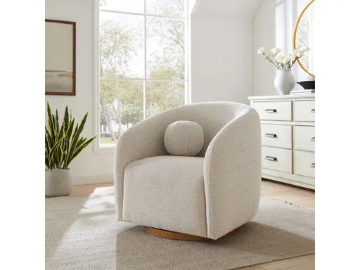 Transform your living space with the Holland Curved Swivel Armchair, where tailored elegance meets modern comfort. Upholstered in a textured chenille-like fabric with boucle-inspired depth, this accent armchair adds a sophisticated, cozy appeal to any room. Better for you and the environment, the upholstery fabric is also OEKO-TEX STANDARD 100 Certified. The unique curved silhouette, sloping armrests, and soft, rounded edges create a minimalist look that feels both contemporary and inviting. Hollands generous foam padding, spring coil support, and smooth swivel base offer plush, cloud-like seating with effortless mobility. Resting on a sturdy wood base with non-marking floor glides, this modern curved chair includes one matching ball accent pillow for added style and comfort. Perfect for living rooms, apartments, or offices, the Holland Barrel Swivel Armchair is a statement piece that blends form and function effortlessly. Arrives fully assembled. Weight Capacity: 800 lbs.
