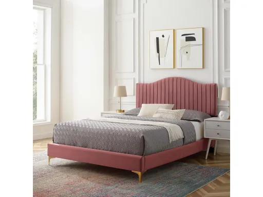 Bring opulent style to the bedroom with the Juniper Performance Velvet Platform Bed. The channel tufting, sweeping curved silhouette, and rich texture of the king size headboard introduces glam deco style and vintage modernity to a master bedroom or guest suite. A king size bed frame covered in stain-resistant performance velvet, this upholstered bed frame is a sturdy mattress foundation for memory foam, innerspring, latex, and hybrid mattresses. Eliminating the need for a box spring, the MDF frame of this king bed is complete with a wood slat support system crafted with poplar for lasting durability and support. This slatted bed frame rests on gold metal legs with non-marking foot caps and includes a reinforced center beam with two support legs for enhanced stability. Assembly required. King Bed Weight Capacity: 800 lbs.