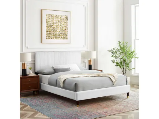 Reimagine master bedroom or guest bedroom decor with the Peyton Channel Tufted Performance Velvet Queen Bed. Rich in vintage modern elegance and glam deco style, the queen headboard of this platform bed features retro channel tufting, luxe velvet texture, and dense foam padding to offer a supportive place to rest while sitting up in bed. A queen size bed covered in stain-resistant performance velvet, this platform bed is a sturdy mattress foundation for memory foam, innerspring, latex, and hybrid mattresses. Eliminating the need for a box spring, the MDF frame of this queen bed is complete with a wood slat support system crafted with poplar for lasting durability and support. This slatted bed frame rests on wood legs with gold metal sleeves and non-marking foot caps and includes a reinforced center beam with two support legs for enhanced stability. Assembly required. Weight capacity: 800 lbs.