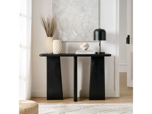 The Porter Console Table redefines versatility with its striking design and solid wood craftsmanship. With a black wirebrushed finish, this 45-inch console table features unique angular legs that create a sculptural, geometric aesthetic, blending artistry with functionality. Perfect for use as a sofa table, hallway accent table, or entryway statement piece, this narrow console table is ideal for both spacious and compact interiors. The natural richness of mango wood highlights its rustic charm, while adjustable levelers ensure stability on uneven surfaces. Whether placed behind a sofa, against a wall, or in your entryway, the Porter Console Table is an artful fusion of form and function. Assembly required. Weight capacity: 176 lbs.
