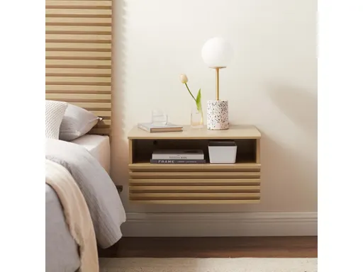 Tap into mid-century aesthetics with the Render Wall-Mounted Nightstand. Detailed with a slatted design, this nightstand features a durable particleboard frame with smooth wood grain laminate and a full-extension glide storage drawer. Boasting a mid-century modern style, this bedside table features a solid construction with a pleasing look and practical functionality that's perfect for the bedroom. A full-extension drawer offers ample storage space to keep your bedside essentials neat and organized. Assembly required.