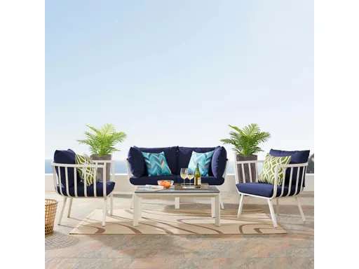 Refresh your outdoor decor with the Riverside Outdoor Patio Aluminum Loveseat Set. This set includes Riverside Outdoor Patio Armchairs and Table. Defined by a crisp, coastal style, this installment of the Riverside outdoor sectional sofa furniture collection features an open slatted back design, angled back legs, and plush 4" thick all-weather UV-resistant fabric cushions. Solidly constructed with a powder-coated aluminum frame, the Riverside outdoor loveseat and armchairs will enhance the look of your patio, backyard, balcony, porch, deck, or poolside area. Table constructed with a white powder-coated aluminum frame and smooth scratch-resistant cement top. This durable, all-weather outdoor coffee table is perfect for any outdoor get together. Includes foot caps. Seat weight capacity: 300 lbs.
