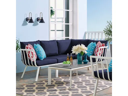 Refresh your outdoor decor with the Riverside Outdoor Patio Aluminum Sectional with Riverside Aluminum Coffee Table. Defined by a crisp, coastal style, this installment of the Riverside outdoor sectional sofa furniture collection features an open slatted back design, angled back legs, and plush 4" thick all-weather UV-resistant fabric cushions. Solidly constructed with a powder-coated aluminum frame, the Riverside sectional will enhance the look of your patio, backyard, balcony, porch, deck, or poolside area. Table constructed with a white powder-coated aluminum frame and smooth scratch-resistant cement top. This durable, all-weather outdoor coffee table is perfect for any outdoor get together. Includes foot caps. Seat weight capacity: 300 lbs.