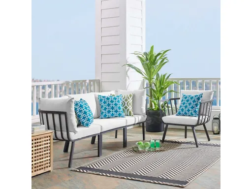 Refresh your outdoor decor with the Riverside Outdoor Patio Aluminum Sofa Set. This set includes the Riverside Outdoor Patio Armchair. Defined by a crisp, coastal style, this installment of the Riverside outdoor sectional sofa furniture collection features an open slatted back design, angled back legs, and plush 4" thick all-weather UV-resistant fabric cushions. Solidly constructed with a powder-coated aluminum frame, the Riverside outdoor sofa and armchair will enhance the look of your patio, backyard, balcony, porch, deck, or poolside area. Includes foot caps. Seat weight capacity: 300 lbs.