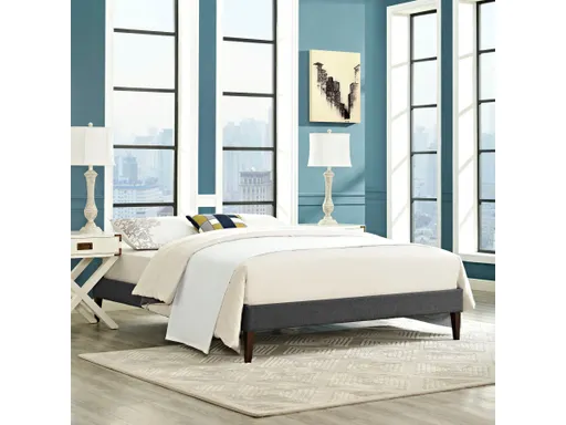 Accelerate your bedroom decor with the Sharon Platform Bed. Made with a solid wood frame upholstered in polyester fabric, Sharon features tapered wood legs, plastic foot glides, ten sturdy wood slats with a central supporting bar, and two support legs for enhanced stability. Due to the wooden slat support system, the use of a box spring is unnecessary. Sharon supports memory foam mattresses such as our Aveline series and is compatible with one of our headboard styles: Jessamine, Terisa, Laura, Phoebe, Camille, and Josie. Perfect for mid-century modern, minimalist, and contemporary bedrooms. Mattress not included.