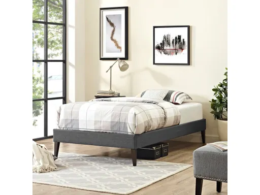 Accelerate your bedroom decor with the Sharon Platform Bed. Made with a solid wood frame upholstered in polyester fabric, Sharon features tapered wood legs, plastic foot glides, ten sturdy wood slats with a central supporting bar, and two support legs for enhanced stability. Due to the wooden slat support system, the use of a box spring is unnecessary. Sharon supports memory foam mattresses such as our Aveline series and is compatible with one of our headboard styles: Jessamine, Terisa, Laura, Phoebe, Camille, and Josie. Perfect for mid-century modern, minimalist, and contemporary bedrooms. Mattress not included.