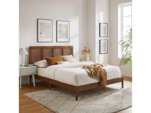 Elevate a primary bedroom or guest bedroom with the Sirocco King Platform Bed, an epitome of sophistication and functionality. This wood bed frame integrates a synthetic rattan headboard with cane webbing, bringing a touch of organic elegance to your bedroom decor. The durable structure of this king platform bed frame with headboard grants longevity and stability, while the wood slats provide reliable support and air circulation, eliminating the need for a box spring and accommodating any mattress type. The three adjustable headboard heights allow for perfect alignment with your mattress, be it innerspring, latex, hybrid, or memory foam. The Sirocco Wood King Size Bed is a statement of style and comfort combined. Assembly required. Weight Capacity: 794 lbs. Set Includes: One King Bed.