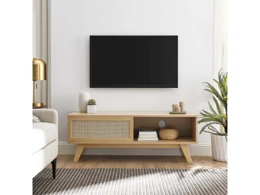 Introduce refreshing style to your living space with the Soma 47" TV Stand. Showcasing a beautiful rattan weave on the sliding door, this entertainment center brings organic aesthetics and modern functionality to the living room, bedroom, home office, or lounge room. This media stand is crafted from durable MDF and particleboard with a natural wood grain design. This TV stand is complete with a sliding door to help conceal media essentials and cable management holes that also allow for flow-through ventilation. Keep visual space clean with ample storage and display space. Soma accommodates TVs up to 52 inches. Includes non-marking foot pads to protect flooring. Assembly required. Weight capacity: 150 lbs.