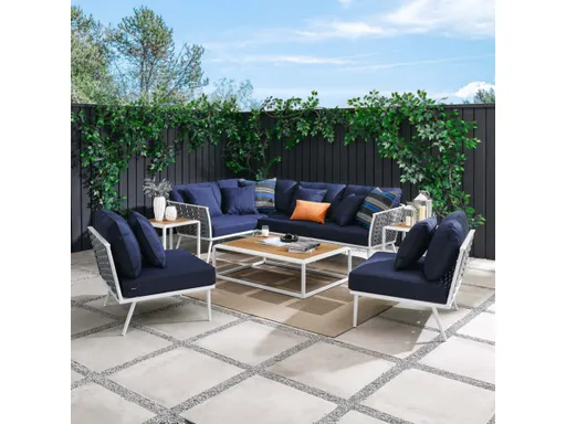 Gather family and friends for pleasant weather and good conversation with the Stance Outdoor Patio Furniture Collection. Boasting a contemporary modern look, the 9-Piece Outdoor Patio Sectional Sofa Set features woven polyester fabric rope seat backs and flared powder-coated aluminum frames, slatted synthetic wood tabletops, and water resistant all-weather fabric cushions with plush 5" thick, dense foam padding provide a relaxing spot to lounge. A versatile set designed for long-lasting durability, each piece in the Stance Collection can be mixed and matched and effortlessly arranged to fit the spontaneous needs of you and your guests. Stance includes non-marking, height-adjustable foot caps. Assembly Required. Set Includes: 1 Left-Arm Chair, 1 Right-Arm Chair, 1 Corner Chair, 3 Armless Chairs, 2 Side Tables, 1 Coffee Table