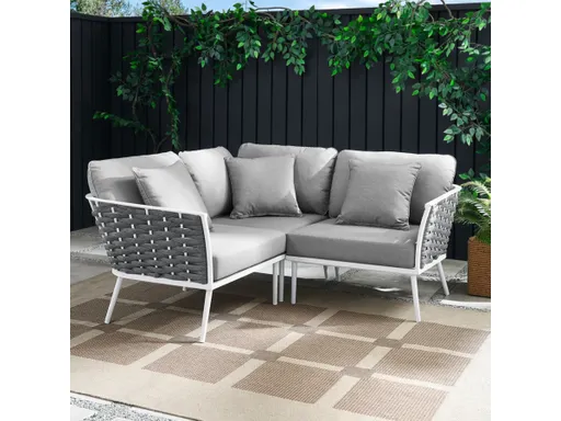 Gather family and friends for pleasant weather and good conversation with the Stance Outdoor Patio Sectional Sofa. Boasting a contemporary modern look, Stance Outdoor Patio Sectional Sofa features woven polyester fabric rope seat back and flared powder-coated aluminum frame, while water resistant all-weather fabric cushions with dense foam padding provide a relaxing spot to lounge. A versatile patio sectional designed for long-lasting durability, each piece in the Stance Outdoor Patio Collection can be mixed and matched and effortlessly arranged to fit the spontaneous needs of you and your guests. Stance includes non-marking, height-adjustable foot caps. Assembly Required. Set Includes: 1 Left-Facing Armchair, 1 Right-Facing Armchair, 1 Corner Chair