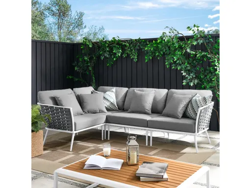 Gather family and friends for pleasant weather and good conversation with the Stance Outdoor Patio Sectional Sofa. Boasting a contemporary modern look, Stance Outdoor Patio Sectional Sofa features woven polyester fabric rope seat back and flared powder-coated aluminum frame, while water resistant all-weather fabric cushions with dense foam padding provide a relaxing spot to lounge. A versatile patio sectional designed for long-lasting durability, each piece in the Stance Outdoor Patio Collection can be mixed and matched and effortlessly arranged to fit the spontaneous needs of you and your guests. Stance includes non-marking, height-adjustable foot caps. Assembly Required. Set Includes: 1 Left-Facing Armchair, 1 Right-Facing Armchair, 1 Armless Chair, 1 Corner Chair