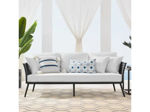 Gather family and friends for pleasant weather and good conversation with the Stance Outdoor Collection. Boasting a contemporary modern look, Stance features a woven polyester fabric rope seat back and flared powder-coated aluminum frame, while waterproof all-weather fabric cushions with dense foam padding provide a relaxing spot to lounge. A versatile set designed for long-lasting durability, each piece in the Stance Collection can be mixed and matched and effortlessly arranged to fit the spontaneous needs of you and your guests. Sofa weight capacity: 551 lbs.
