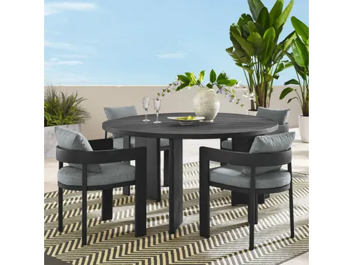 Enliven your alfresco spaces with the Tahoe Aluminum Outdoor Dining Set for 4. This modern 5- piece patio dining set includes a round dining table and four chairs, all constructed with well-crafted, durable powder-coated aluminum, dispensing contemporary elegance in your outdoor dining spaces. Each Tahoe Aluminum Patio Chair features an open curved back and is designed with removable, stain-resistant cushions filled with dense foam padding and covered in sunproof, water-resistant fabric. The matching 59-inch round patio table complements the chairs with its low-maintenance design, slatted top, and practical umbrella hole with a fitted lid, perfect for year-round functionality. This 5-piece patio dining set features a table with easy-to-follow assembly instructions and pre-assembled chairs, all equipped with non-marking foot glides to safeguard your deck or patio floor. Weight capacity - chair: 300 lbs. Dining table: 220.5 lbs.