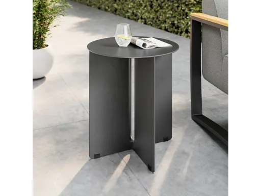 Clean minimalist design and sleek modern lines come together in the Tecton Aluminum Outdoor Patio Side Table. Crafted with a powder-coated aluminum top and base for a durable, weather-resistant finish, this metal patio side table showcases geometric precision and compact, sculptural quality. The intersecting base, featuring a central thin cut-out where the panels meet, creates a captivating visual flow, making the outdoor end table appear lighter and more modern. With a round table top and smooth edges, this metal outdoor side table features a simple aesthetic and is sturdy enough to support an afternoon drink, books, or potted plants. Ideal as a chic pool side table, a front porch table or an outdoor garden table, Tecton comes equipped with plastic glides to protect your outdoor flooring. Arriving fully assembled, this 15 inch all-around small accent patio table is perfect for enhancing gardens, patios, or poolside lounging with its stylish modernity. Weight Capacity: 56 lbs.