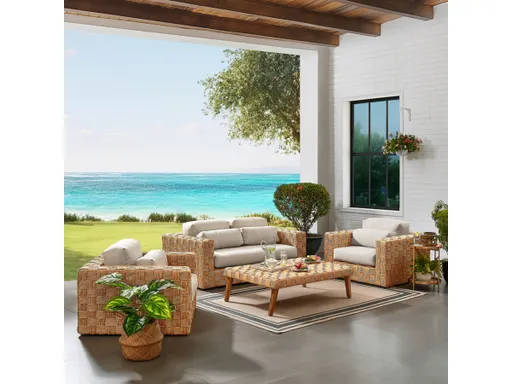 Create a serene outdoor retreat with the Thames Outdoor Furniture Set. This complete 4-piece patio furniture set includes one loveseat, two armchairs, and a coffee table. All constructed with a sturdy powder-coated aluminum frame and enveloped in premium synthetic woven rattan that boasts a textured, basket-like weave, this modern furniture patio brings earthy tones to your outdoor decor. The loveseat and armchairs are fitted with upholstered fabric cushions, designed with rolled edges and accompanied by lumbar throw pillows for added comfort. Their deep seats are perfect for cozy evenings or lazy weekend mornings. Non-marking foot caps protect your outdoor surfaces, allowing you to move and position the Thames Backyard Furniture Set around with ease. The entire 4-piece patio set is UV-resistant and water-repellent, offering comfort that lasts season after season, making it an ideal addition for your patio, deck, or garden. With basic assembly, this outdoor patio wicker patio furniture set invites you to unwind in style. Weight capacity: 800 lbs. for the loveseat, 400 lbs. per armchair, 400 lbs. per coffee table.