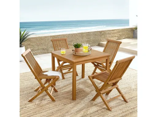 Refresh your outdoor dining experience with the 5-Piece Patio Dining Set. This modern outdoor patio set includes a solid teak wood square dining table and 4 foldable chairs, perfect for accommodating both casual meals and small gatherings. The naturally weather-resistant teak outdoor dining table features a slatted surface, enhancing its visual appeal and durability. The foldable teak chairs offer convenience and ease of storage without sacrificing style or comfort. Whether used on its own or mixed with other outdoor patio furniture, this 5-piece outdoor dining set blends effortlessly, complementing a diverse range of garden, porch, and patio settings. Assembly required.