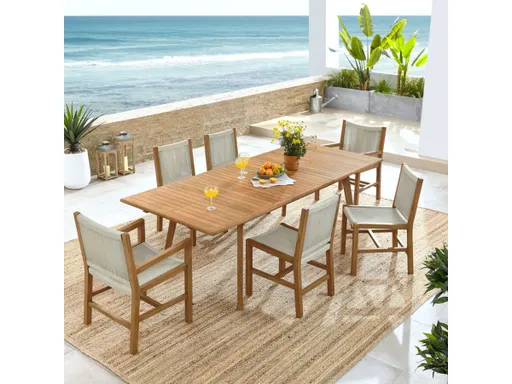 Refresh your outdoor dining experience with the 7-Piece Teak Rectangular Table Patio Furniture Set. This modern outside patio set includes the Vienna Extendable Teak Dining Table and 6 Vienna Outdoor Dining Chairs, with 4 armless chairs and 2 with armrests, effortlessly accommodating larger gatherings along with everyday outside dining. The naturally weather-resistant teak outdoor dining table features a slatted surface and extends from 71" to 94.5", making it perfect for hosting more guests or adjusting to fit your outdoor patio needs. Add to that, its wood dining chairs woven with high-quality nylon rope, and this patio dining furniture set for 6 creates a contemporary and cohesive look ideal for any patio or garden setting. Whether used on its own or mixed with other outdoor patio furniture, the Vienna 7-piece patio dining set blends effortlessly, complementing a diverse range of outdoor patios. Assembly required.