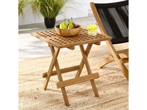 Refresh your outdoor lounging experience with the Vienna Folding Wood Side Table, an al fresco addition that invites relaxation and functionality. This patio side table, crafted from beautiful teak wood that is naturally weather-resistant, features a unique square-grid top that creates a contemporary and cohesive look ideal for any patio or garden setting. Conveniently foldable, this outdoor wood end table is perfect for easy storage and quick setup. Add to that its robust stretchers, and the Vienna Small Teak Patio Table offers the stability needed for supporting drinks, snacks, books or decorative accents. Whether used as an outdoor tray table, a deck side table, a porch table, or paired with the complete Vienna Outdoor Teak Wood Furniture Set, this folding end table complements a diverse range of outdoor patios. No assembly required.