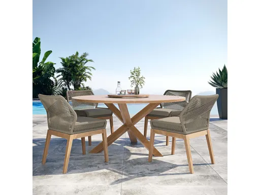 Enjoy the company of family and friends or a peaceful morning of relaxation gathered around the Wellspring 5-Piece Outdoor Patio Dining Set. Crafted with premium solid teak wood that is naturally weather-resistant, this round outdoor table features a contemporary trestle base situated on non-marking foot pins to protect outdoor flooring. This dining table boasts a beautiful wood grain and a removable lazy Susan for easy serving. Measuring 63" in diameter, the outdoor table is complete with four patio chairs featuring a premium solid teak wood base with stretchers and non-marking foot pins. These patio chairs boast woven rope detail on the aluminum seat frame, a crisscross pattern along the backrest, and removable cushions with dense foam padding and ties to ensure a secure seat. The Wellspring Dining Set is a charming addition to a backyard, patio, porch, deck, or poolside. Assembly required. Chair weight capacity: 220 lbs.