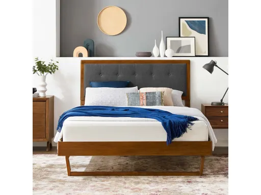 Refresh your master bedroom or guest room with the modern style, retro detail, and organic aesthetics of the Willow Tufted Wood Full Platform Bed. Inspired by mid-century style, the upholstered headboard of this full bed frame features a beautiful wood frame that encases a button tufted design. This platform bed frame is a sturdy addition to the bedroom with a durable wood, MDF, and veneer construction and an angular rubberwood frame. Eliminating the need for a box spring, this full bed is complete with a wood slat support system, reinforced center beam, and supporting legs that make it a lasting mattress foundation for memory foam, latex, innerspring, and hybrid mattresses. Assembly required. Full bed frame weight capacity: 601 lbs.