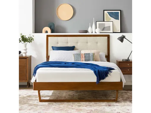 Refresh your master bedroom or guest room with the modern style, retro detail, and organic aesthetics of the Willow Tufted Wood Full Platform Bed. Inspired by mid-century style, the upholstered headboard of this full bed frame features a beautiful wood frame that encases a button tufted design. This platform bed frame is a sturdy addition to the bedroom with a durable wood, MDF, and veneer construction and an angular rubberwood frame. Eliminating the need for a box spring, this full bed is complete with a wood slat support system, reinforced center beam, and supporting legs that make it a lasting mattress foundation for memory foam, latex, innerspring, and hybrid mattresses. Assembly required. Full bed frame weight capacity: 601 lbs.