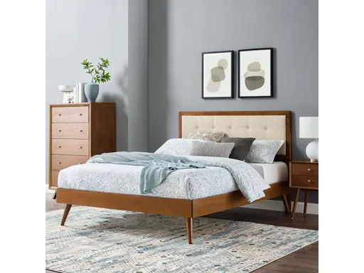 Refresh your master bedroom or guest room with the modern style, retro detail, and organic aesthetics of the Willow Tufted Wood Queen Platform Bed. Inspired by mid-century style, the upholstered headboard of this queen bed frame features a beautiful wood frame that encases a button tufted design. This platform bed frame is a sturdy addition to the bedroom with a durable wood, MDF, and veneer construction and splayed rubberwood legs. Eliminating the need for a box spring, this queen bed is complete with a wood slat support system, reinforced center beam, and supporting legs that make it a lasting mattress foundation for memory foam, latex, innerspring, and hybrid mattresses. Assembly required. Queen bed frame weight capacity: 601 lbs.