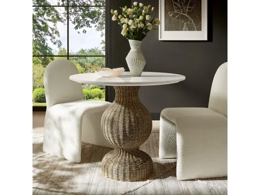 A stunning blend of organic texture and refined elegance, the Zale Round Dining Table brings a unique sculptural presence to any space. Featuring a 36 inch marble tabletop, this modern bistro table comfortably seats two to four people, making it an ideal choice for small dining areas, kitchens, or cozy cafe-style nooks, or as a versatile entryway table in a hallway or foyer. The gracefully curved pedestal base, crafted from handwoven seagrass, adds an artisanal touch, highlighting natural materials with an airy, coastal-inspired feel. The contrast between the sleek marble top and the warm, textured base makes this round pedestal table a perfect centerpiece for both modern and vintage interiors. Non-marking floor glides help protect surfaces, ensuring stability while maintaining a seamless, sophisticated look. Simple assembly is required.