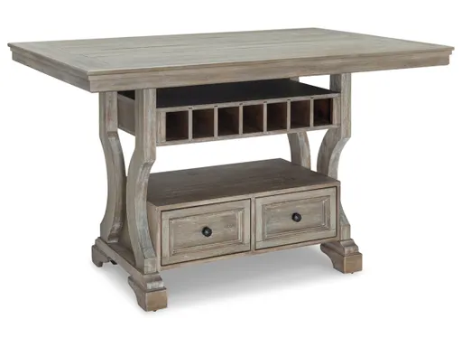 Put a simple twist on your approachable sense of style with the classically charming Moreshire counter height dining table. A glazed bisque finish covers the wire-brushed textural surface, with natural wood undertones bringing additional dimension. Storage drawers, a shelf and wine cubbies decorate the base, infusing this chic piece with elegant functionality.