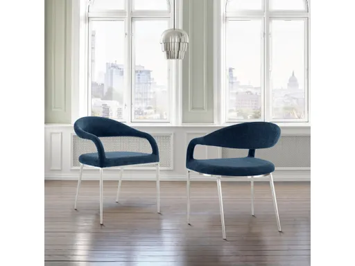 Transform any space with the luxurious charm and comfort of the Morgan Dining Chair in Fabric and Metal - Set of 2 by Armen Living. The cozy yet streamlined profile of our chair offers comfort with a touch of opulence. Its beautifully curved back and seamlessly flowing arms lend refinement to this dining chair and any room you put it in. The back, arms, and seat cushion are fully upholstered to offer hours of comfort. The Morgan chair is covered in performance fabric, which provides easy care and maintenance. Perched on four slender legs, this dining chair serves as a stylish complement to any contemporary or modern room. From casual to formal meals, elevate your eat-in kitchens and dining rooms to the simple elegance of the Morgan Dining Chair. Beyond dining, it can offer a chic and comfortable accent chair anywhere from your living space to your home office. Available as a set of two, the Morgan Upholstered Dining Chair comes in matte black iron with Light Gray, Charcoal, or Blue Fabric, or brushed stainless steel with Light Gray, Charcoal, or Blue Fabric to bring comfort and grace to your home.