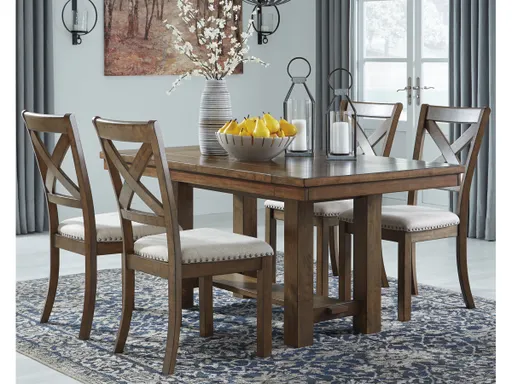 Moriville dining room set elevates the art of casual rustic style. The extension table’s clean-lined, farmhouse profile is beautified with a distressed nutmeg finish and thick planked effect top for added charm. And with not one but two drop-in leaves, you can easily accommodate eight with plenty of elbow room. Cushioned X-back chairs encourage lingering meals enjoyed in comfort.