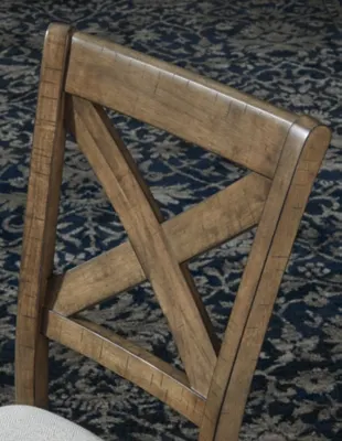 Moriville upholstered dining chair elevates the art of casual rustic style. With a distressed nutmeg finish, antiqued nailhead trim and textured polyester fabric, this upholstered dining chair with classic X back styling entices with warmth and earthy elegance. Cushioned seat accommodates lingering meals enjoyed in comfort.