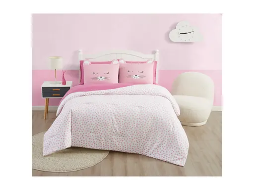 A simple polka dot print provides a home for your feline friend in this amusing set that includes all your bed needs. The comforter features a minimal pink-on-white polka dot print with a solid white reverse. The pillow sham features a sleeping cat face print with attached fabric ears to bring it to life. This set includes sheets and pillowcase in a coordinating pink. All items are made of a microfiber polyester and the comforter has a polyester fill. This set is CPSIA Certified Safe, which means it is lead free and phthalate free so your little one will not just have fun, but also be secure.
