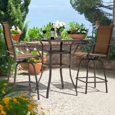 Every outdoor dining space needs a patio table, make it interesting with this three-piece outdoor patio bar set. The table's svelte iron top can be the center for conversation as well as to hold the drinks for your BBQ. The table has attractive bowed legs and the welded frame adds durability and stability. The swivel bar chairs perfectly create the mood for great conversation and cafe style dining. This set is an ideal choice for outdoor amusement in the garden, on the porch or in the yard, this two-piece bistro set makes a lovely relaxing environment where you can catch up with friends or family over coffee or a glass of wine.
