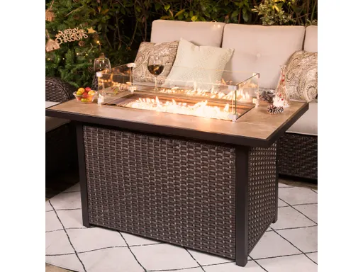 Add glamour and mystery to your nights with this Nuu Garden Gas Fire Pit Table. The easy-care ceramic tabletop and wicker rattan base bring a classic and elegant look to your outdoor space. Dancing flames elegantly reflect on the glass guard and shine with a flickering effect. From intimate conversations around a cozy fire to stargazing on cold winter nights, our wonderful fire pit will have no trouble gathering everyone together for hours of quality time.