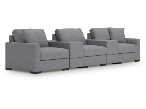 The Omaha by Ashley sectional with storage evolves as your family’s needs do. Its adaptable modular design makes staging and rearranging a breeze. Living room messes leaving you stressed? Cleaning is that much easier with stain-resistant and durable Next-Gen Nuvella™ fabric. Handy consoles with subtle storage keep all your remotes corralled. From easygoing mornings to family movie nights, this sectional brings fashionable function to everyday lounging.