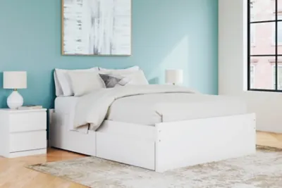 Create the modern bedroom of your dreams. The Onita queen platform bed offers a minimal design with maximum style, combining ultra-clean lines and an easy-elegant solid white finish with a hardware-less aesthetic. Four spacious storage drawers with ball-bearing glides make putting things away a snap. And this bed doesn't need a box spring or foundation, so you can splurge on a mattress that's sure to carry you away to a soothing place.