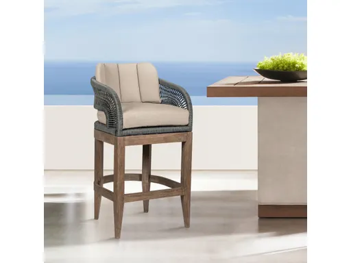 Meet the Orbit Outdoor Patio Bar or Counter Stool - a perfect fusion of natural elegance and contemporary design, meticulously crafted to elevate your outdoor entertaining space. This versatile stool seamlessly combines the enduring beauty of eucalyptus wood with the modern appeal of rope accents and olefin cushions, creating a stylish piece of outdoor furniture that marries aesthetics with resilience. The eucalyptus wood frame of the Orbit Outdoor Patio Bar or Counter Stool introduces a timeless touch to your patio, enhancing the outdoor ambiance with its organic charm. The weather-resistant properties of eucalyptus wood ensure durability, promising longevity in the face of changing weather conditions. Designed for both style and endurance, this stool boasts water-resistant and UV-resistant features, providing a steadfast seating solution for your outdoor bar or counter area. Whether under the sun or facing unexpected rain, the Orbit Stool stands as a durable and chic addition to your outdoor entertaining ensemble. The contemporary touch of rope accents adds visual interest to the design, creating a striking contrast with the natural beauty of eucalyptus wood. Paired with plush olefin cushions in a neutral hue, the Orbit Stool invites your guests to relax in comfort and style. The water-resistant capabilities and easily removable cushion covers make maintenance effortless, ensuring your outdoor space remains inviting and fresh. Elevate your outdoor entertaining experience with the Orbit Outdoor Patio Bar or Counter Stool in Eucalyptus Wood. Its distinctive design not only enriches your patio but also provides a comfortable and contemporary seating solution. This beautiful barstool is available in 26 inch and 30 inch seat heights to suit all of your needs.