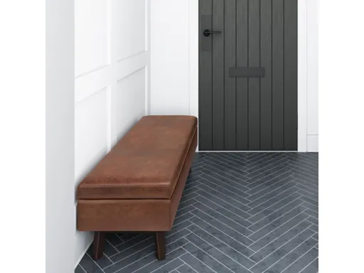Update your space with the Owen Mid Century Storage Ottoman. Its modern style will add a fresh on trend look to your home. It features a lift up lid and a large interior storage space. Made with solid wood and distressed Faux Air Leather for stylish durability and comfort. Whether used in the living room, family room or den, it will be the showpiece that completes the room.; Efforts are made to reproduce accurate colors, variations in color may occur due to computer monitor and photography; At Simpli Home we believe in creating excellent, high quality products made from the finest materials at an affordable price. Every one of our products come with a 1-year warranty and easy returns if you are not satisfied