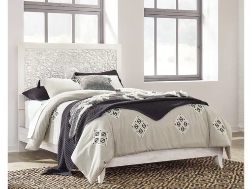 Your young trendsetter can live out her free spirit with the Paxberry queen bed. Exquisite carved medallion pattern is a testament to true style. Charming whitewashed finish sets a foundation for a room bursting with personality. Headboard legs have four height options to grow with your child.