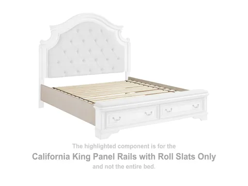These California king panel rails with roll slats are made with poplar solids and engineered wood, with cast resin components. Pairs with other items in the series to make a bed kit.