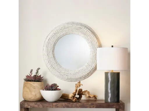 Hundreds of hand carved wood beads are arranged one at a time, by size and shape, to form the glorious frame that surrounds this round wall mirror. As no two beads will be the same, no two mirrors will be identical. Hang several together for an eye-catching display, or place just one within a gallery wall for a reflective counterpoint.