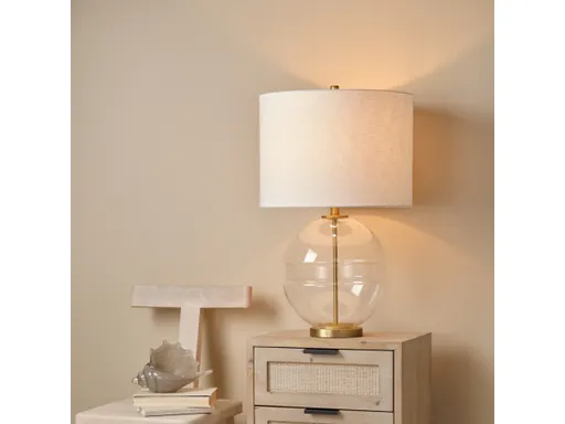 Metal and glass combine to create a table lamp that is both bold and delicate. The clear spherical glass surrounding the iron axis of the lamp is like a celestial body in orbit. This table lamp is both simple and sophisticated and finds itself at home on a console, living room table, dining buffet, or anywhere else that needs illumination.