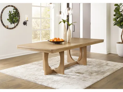 The Rencott dining extension table's classic yet contemporary good looks are hard to deny. Its geometric double pedestal base is effortlessly eye-catching, while a metal inlay on the tabletop offers a subtly striking touch. With a light oak finish and wire-brushed wood grain texture, this table lends an organic appeal to your delicious dining space ... or wherever family and guests gather.