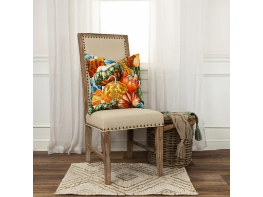 Invite the hues of the fall season into your home with this beautiful accent pillow. The 20" x 20" piece features a cheerful pumpkin pattern, constructed in a sturdy cotton duck fabric with hand embroidery for added dimension and texture. Its colorful shades of orange, green, blue, and gold create a nature-inspired modern industrial style to any decor. Immerse your living space in the vivid colors of autumn with this striking accent pillow, exclusively from Rizzy Home.