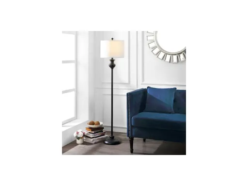 The Erlan Floor Lamp takes the best of traditional design and skillfully sculpts it to fit today's versatile decor. Adorned with a petite, pottery inspired accent carved on its antique black metal frame, Erlan stands tall in any room, finished with a white linen drum shade for a contemporary touch.