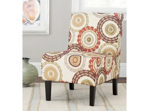 The Marka armless club chair features a clean and elegant design that's perfect for smaller spaces. A generously padded seat and back, wrapped with earthy sunburst motifs in beige, brown, orange and green cotton, sit atop sturdy birch wood legs in a dark brown finish.